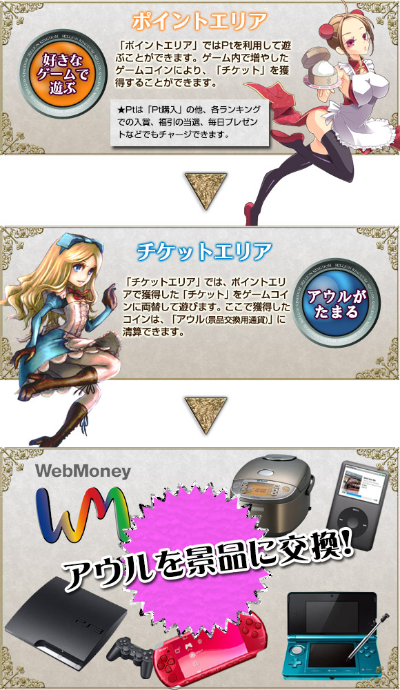 ミリオンキングダムサイト内での通貨に当たり、景品交換に必要なものです。同額のowlの景品と交換することができます。入手方法:チケットエリアで獲得したコインを清算する、毎日プレゼント等