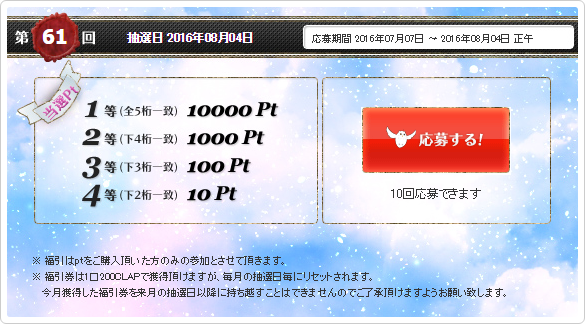 応募にはくじ1枚につき福引券1枚を消費します。入手方法:200CLAP獲得につき1枚