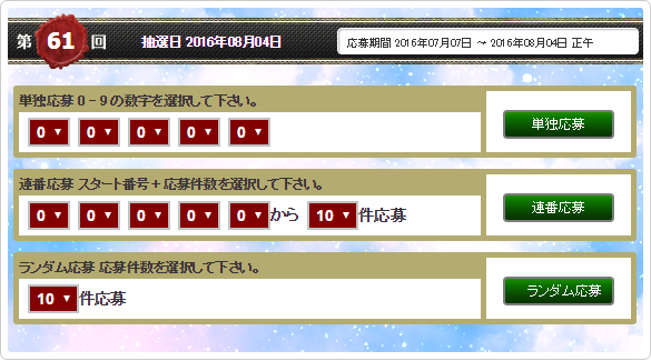 抽選件数を選択する事でランダム応募が可能となります。 選ぶのが面倒な方はこちらをお使い下さい。