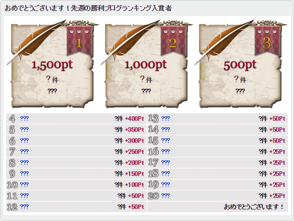 勝利ブログの件数ランキングを週単位で開催しており、ランキング上位入賞者には特典をご用意しております。