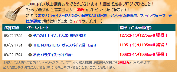 チケットエリアで1,000コイン以上を獲得すると勝利ブログを書き込めます。 スタッフ確認後、翌営業日以内に30Ptをプレゼントさせて頂きます。記入期限は獲得日から3日以内となっております。記入内容があまりにも乏しい場合はPtが付与出来ない場合がございます。 勝利ブログ記載の案内は、各ゲームのチケットエリアで1,000コイン以上獲得すると利用ゲームページに出現します。